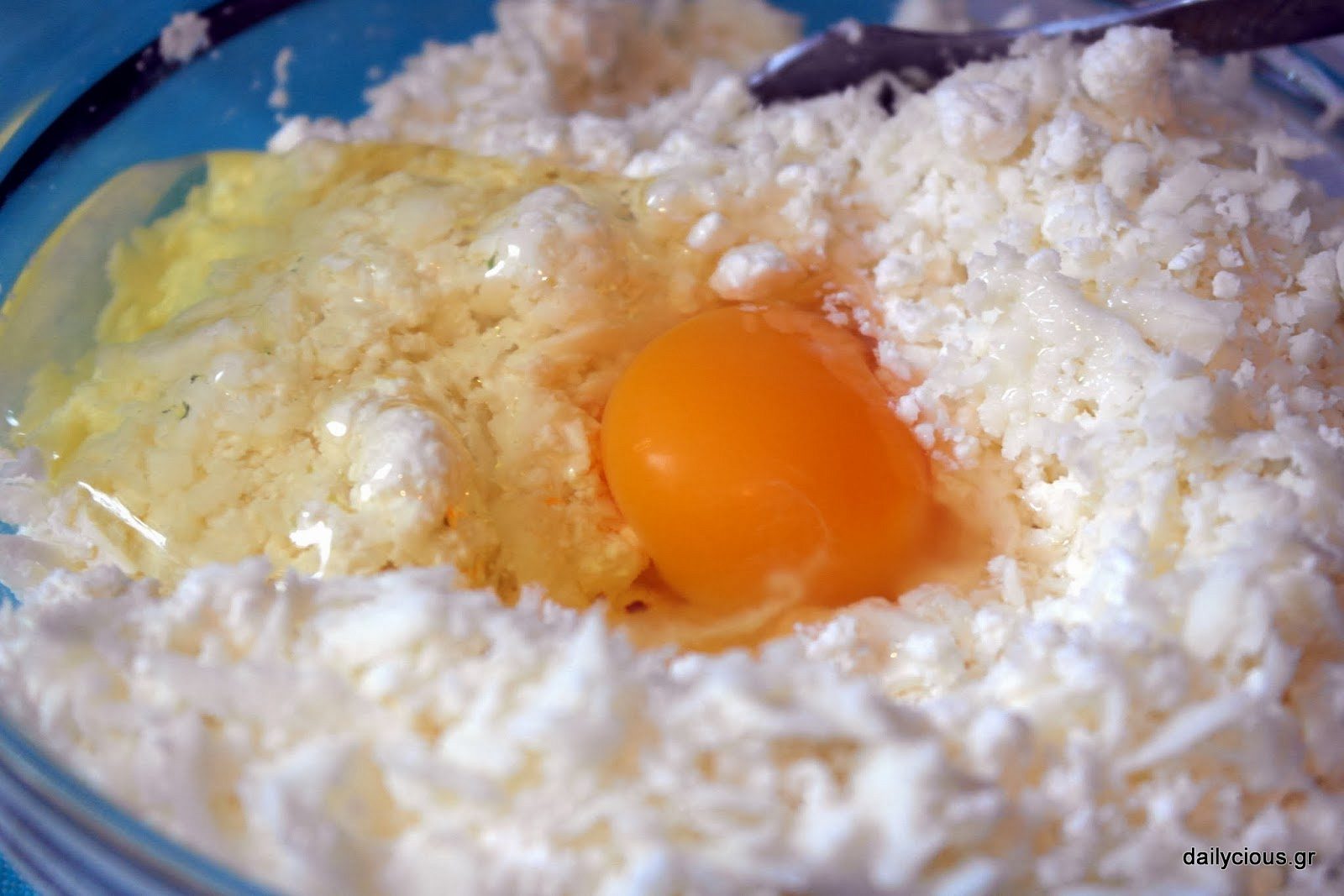 Σ’ ένα μπολ πατάω με το πιρούνι την φέτα, ρίχνω το αυγό κι ανακατεύω. Σ’ ένα άλλο μπολ τοποθετώ τα τριμμένα γλυκά τυριά.