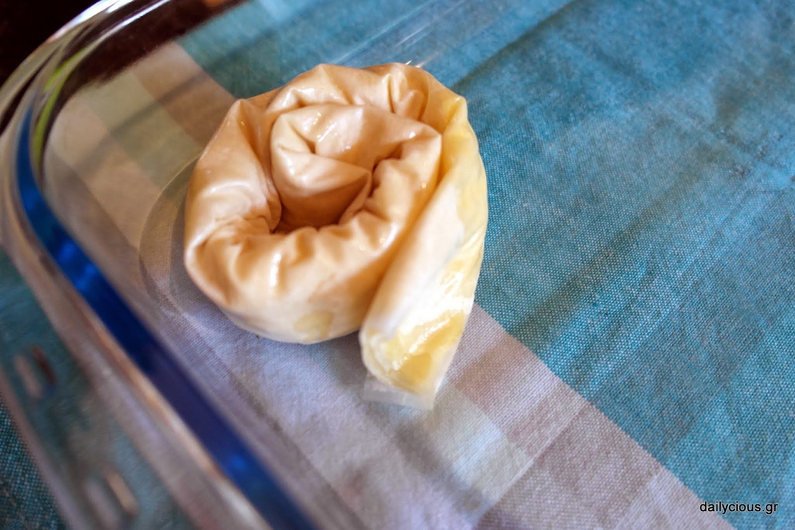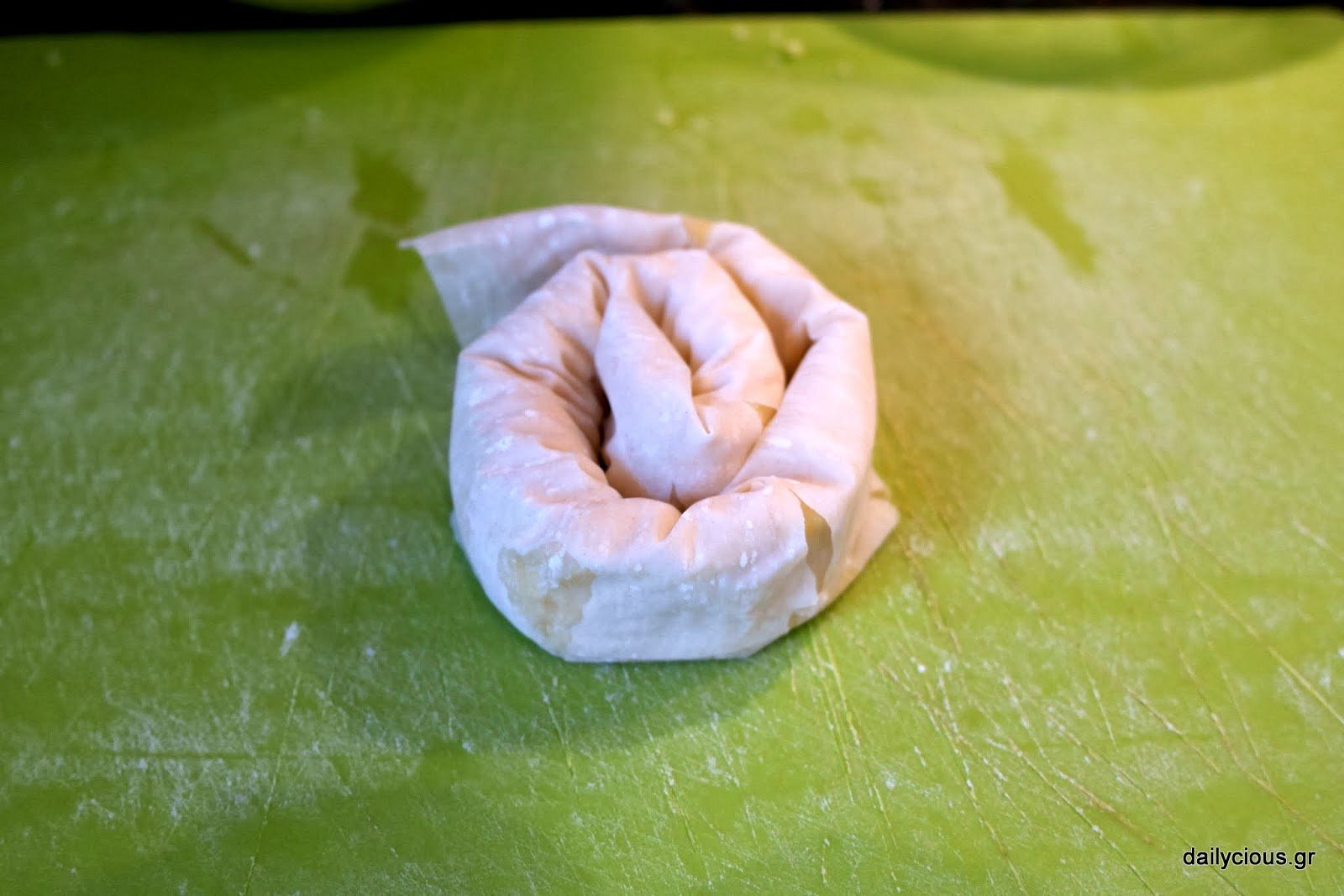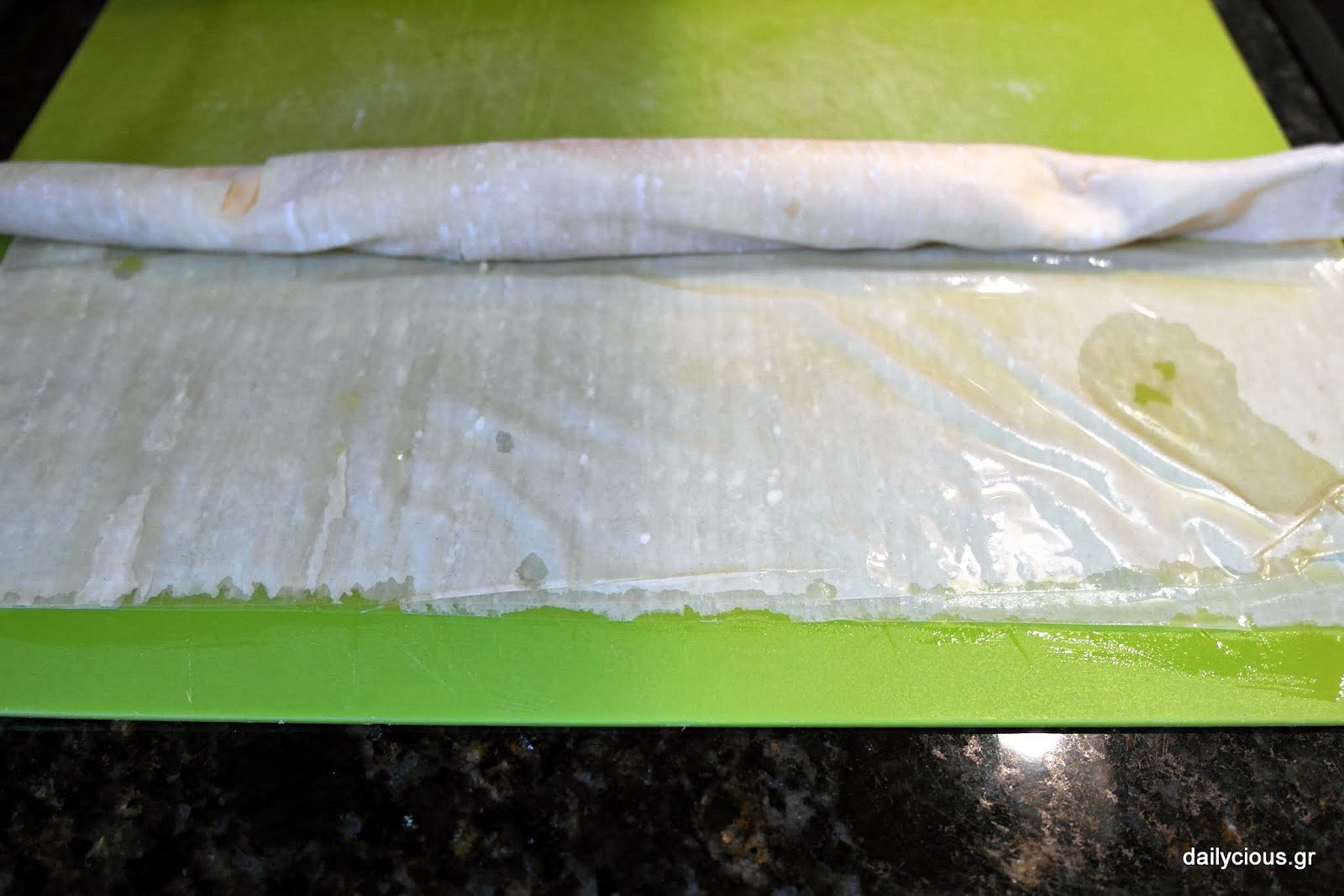 Τυλίγω το φύλλο σαν ρολό, από την πλευρά του τυριού προς την άλλη άκρη.