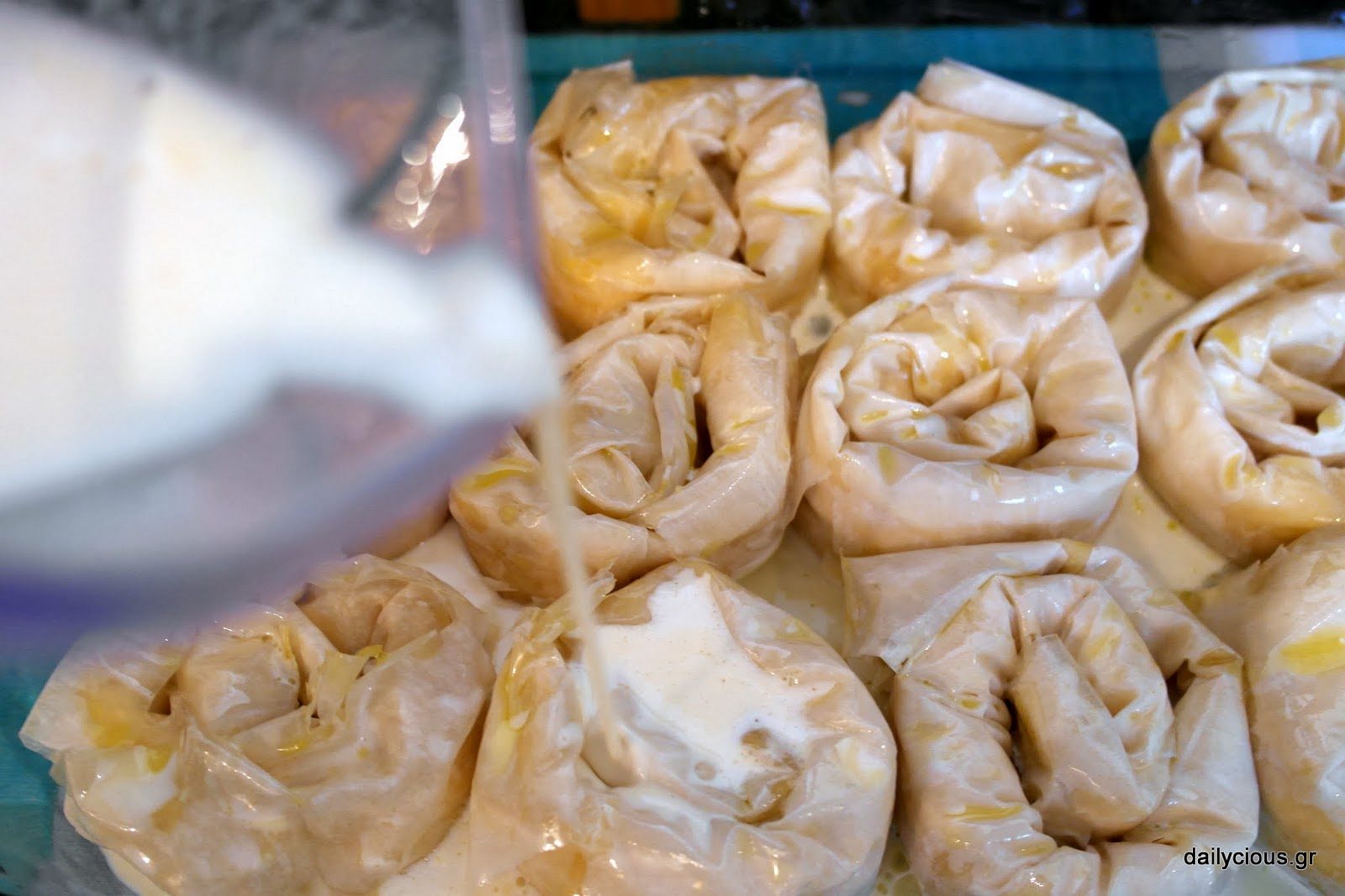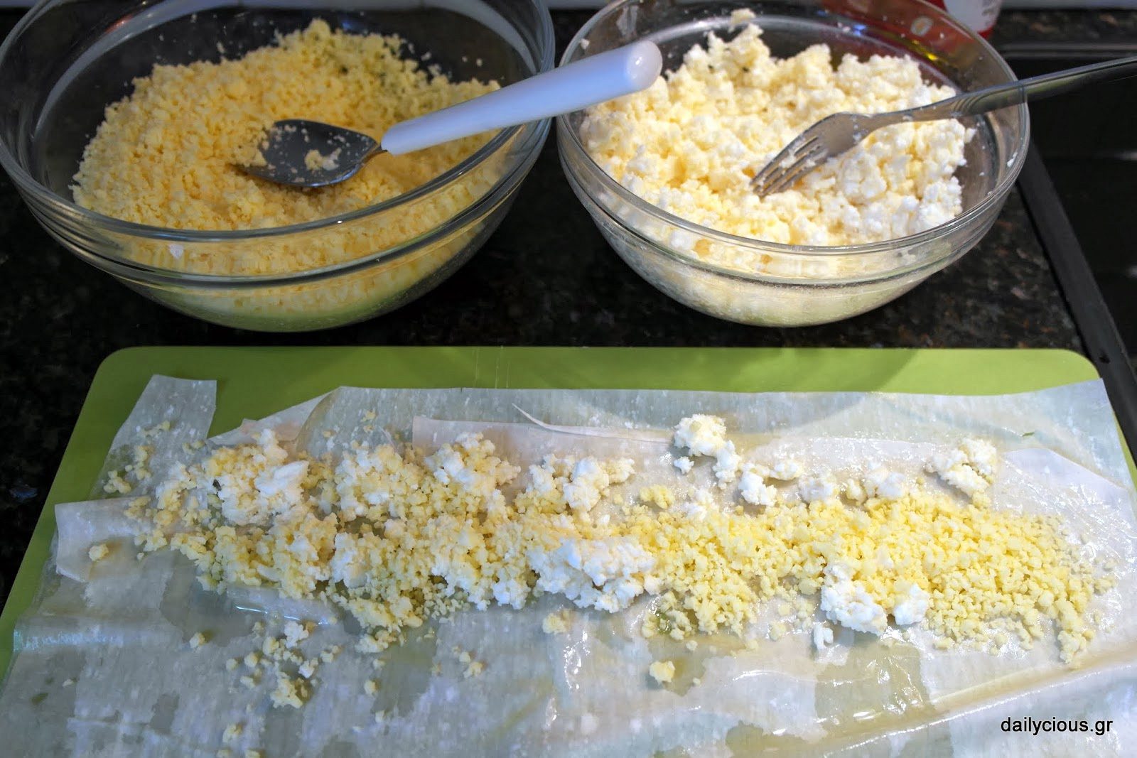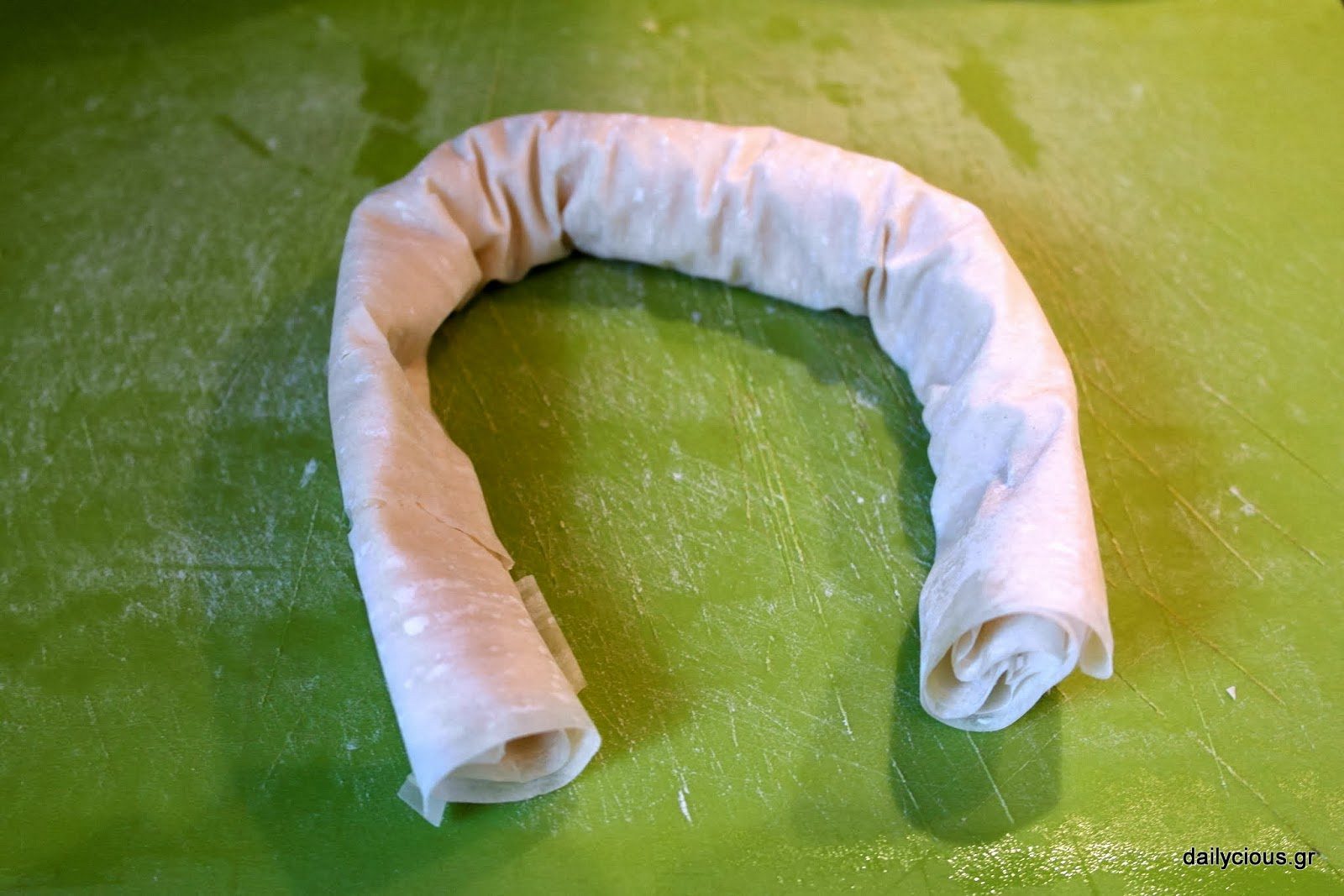 Τυλίγω το φύλλο σαν ρολό, από την πλευρά του τυριού προς την άλλη άκρη.