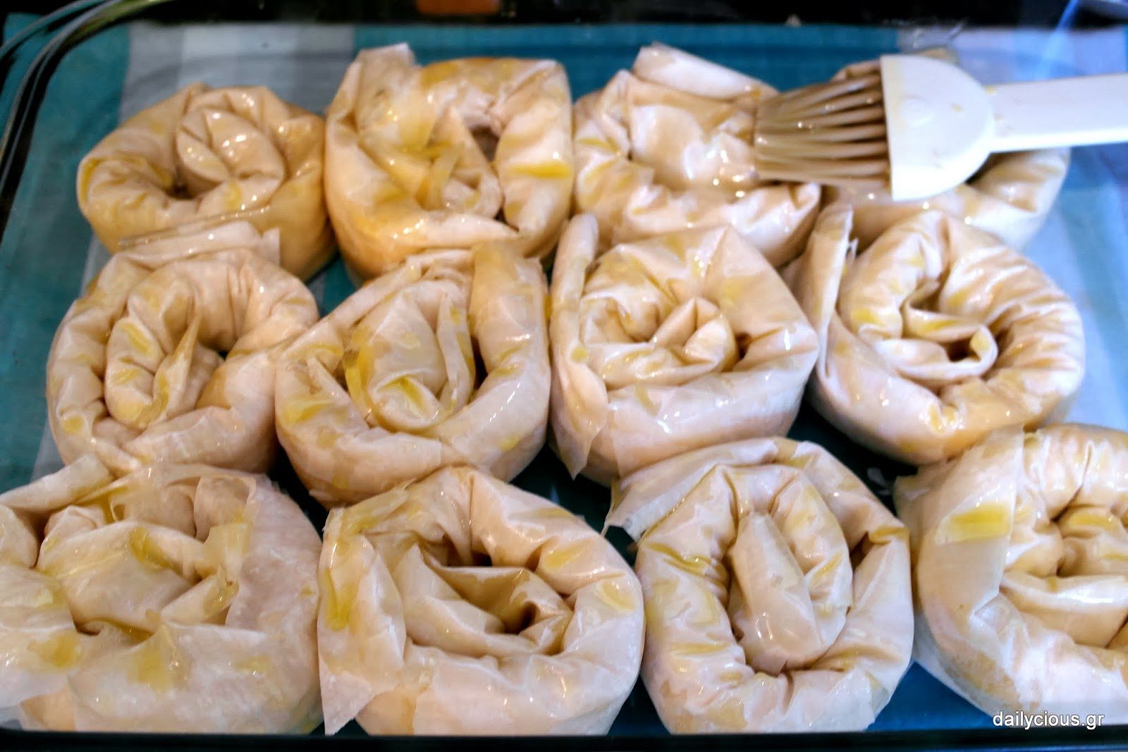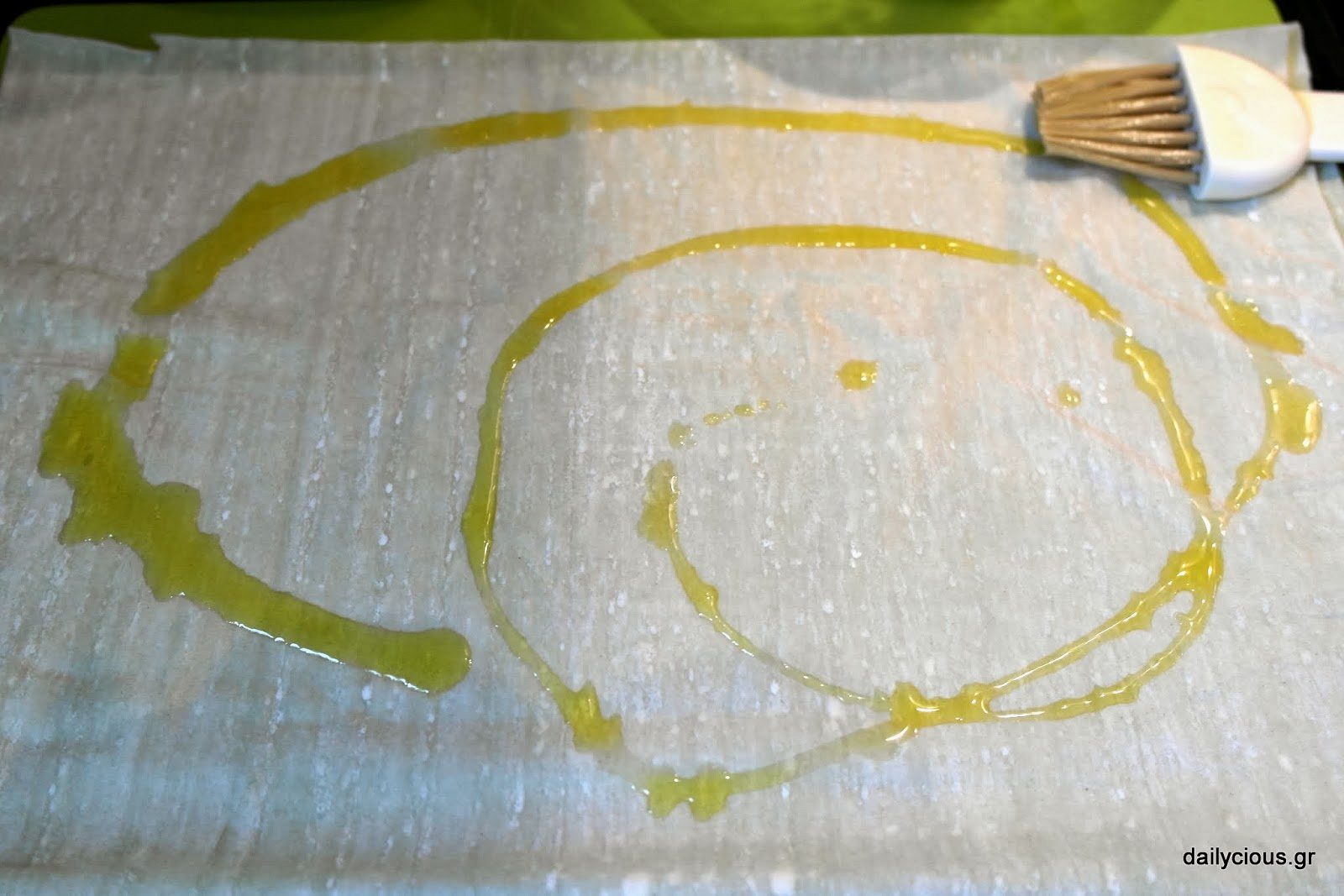 Παίρνω ένα φύλλο διπλωμένο στα δύο και το αλείφω με λίγο λάδι από την μια πλευρά.