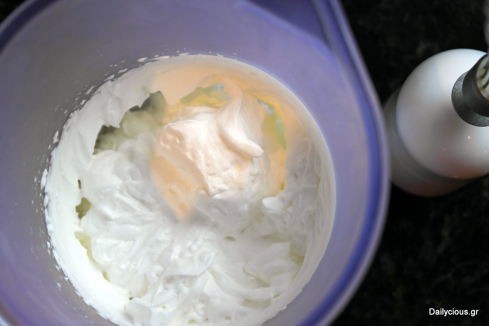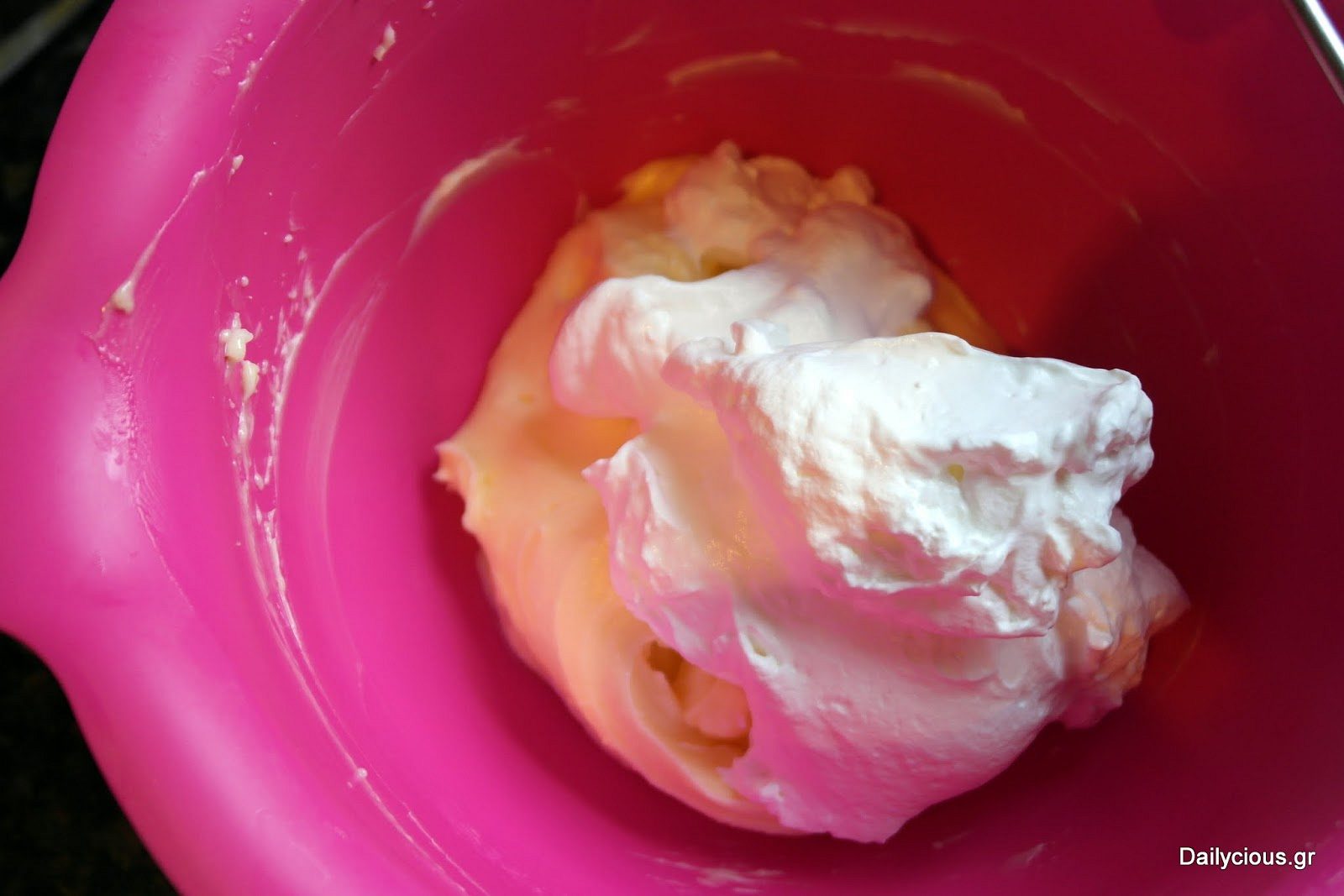 Με μία σπάτουλα προσθέτω την σαντιγί στην βουτυρόκρεμα και την ενσωματώνω με κυκλικές κινήσεις από πάνω προς τα κάτω, περιστρέφοντας ταυτόχρονα το δοχείο προσέχοντας να μην χάσει τον όγκο της.