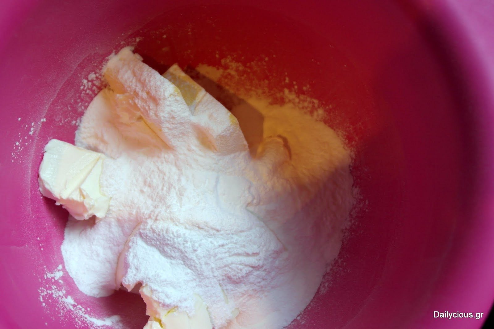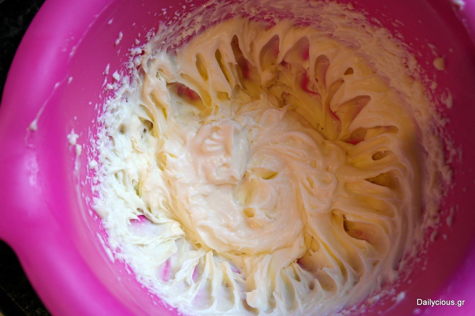 Χτυπάω στο μίξερ το βούτυρο, το τυρί κρέμα, την άχνη ζάχαρη και την βανίλια μέχρι να έχω μία παχύρευστη ομοιογενή κρέμα.
