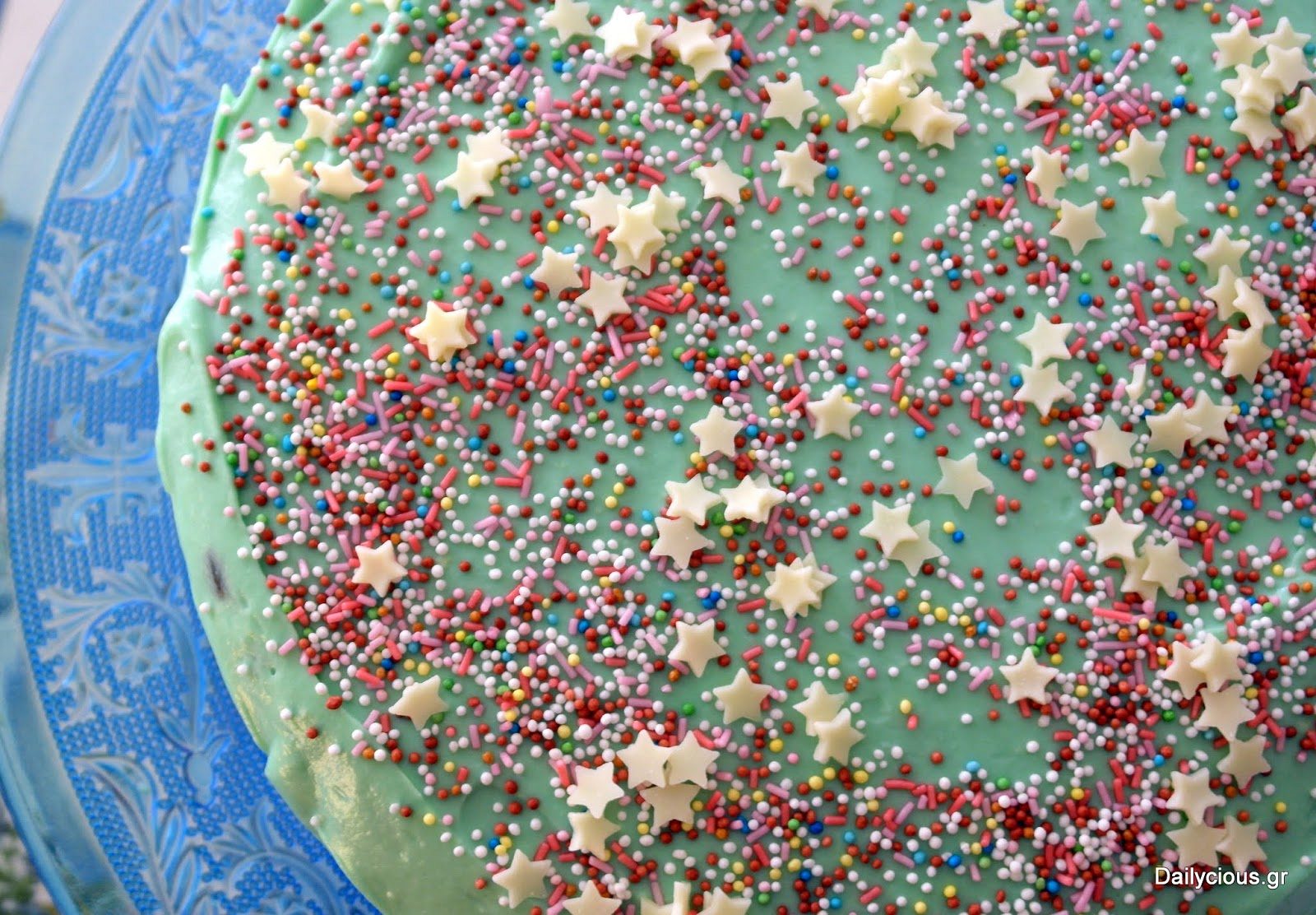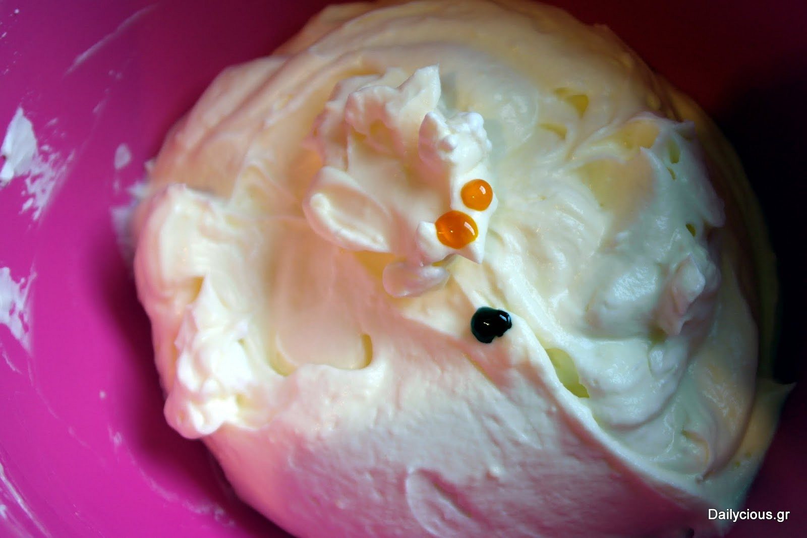 Η βουτυρόκρεμα είναι έτοιμη και μένει μόνο να προσθέσω 3-4 σταγόνες από το χρώμα ζαχαροπλαστικής που θέλω να της δώσω (ανακατεύω πάντα με προσοχή για να μην χάσει τον όγκο της). Εμείς με τον Χρήστο βάλαμε δύο σταγόνες κίτρινο και δύο μπλε και φτιάξαμε αυτό το ωραίο πράσινο της μέντας. Εναλλακτικά μπορώ να προσθέσω κόκκινο και κίτρινο για ένα φωτεινό και γλυκό πορτοκαλί…
